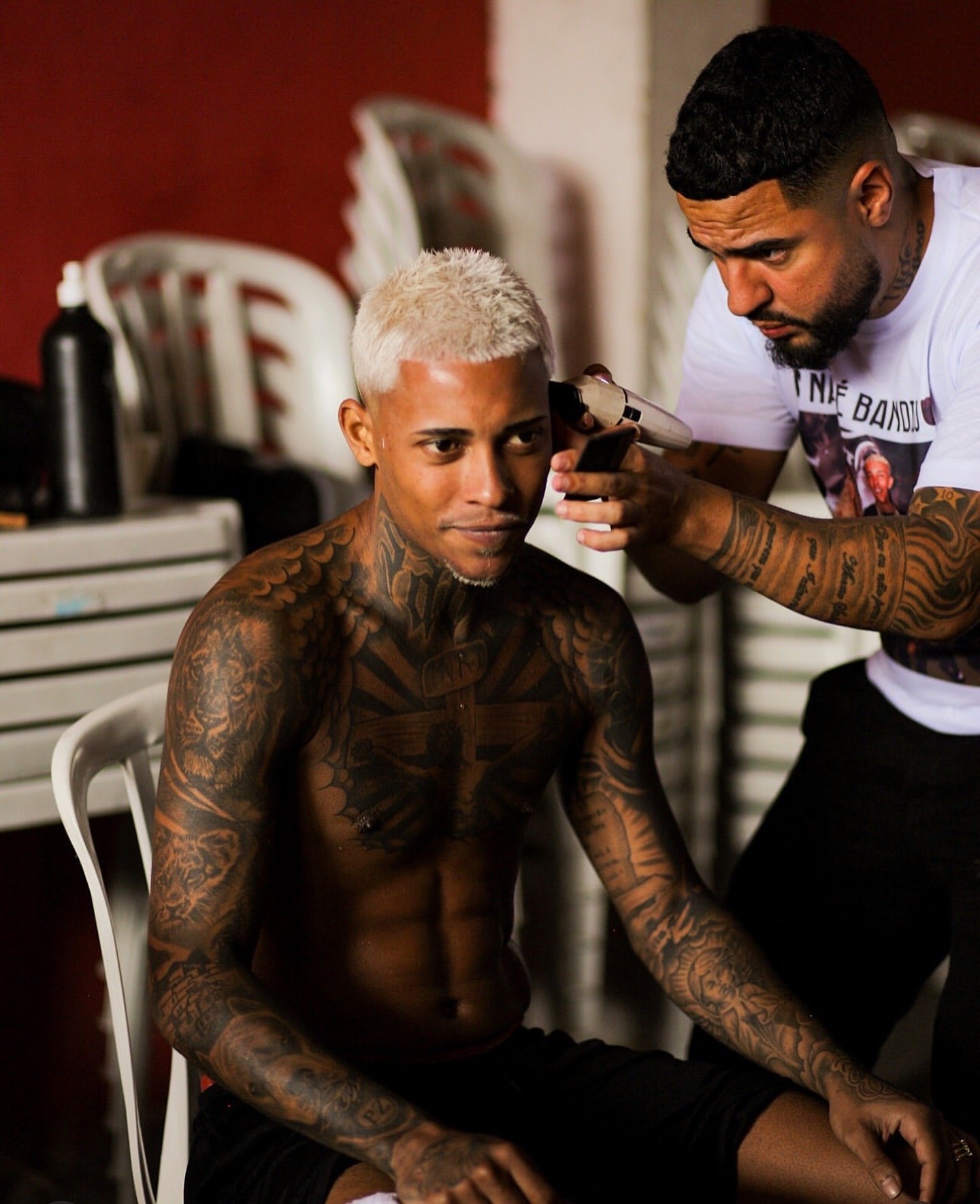 Em meio a essa movimentação um gesto simbólico se destaca: Poze pinta o cabelo ali mesmo, na rua, diante das câmeras. Descolore, faz o famoso “nevou” (corte na régua descolorido no loiro bem claro , tipo neve ) e essa estética que carrega e afirma história e pertencimento, porque ele demarca a estética da favela porque isso também é poder.