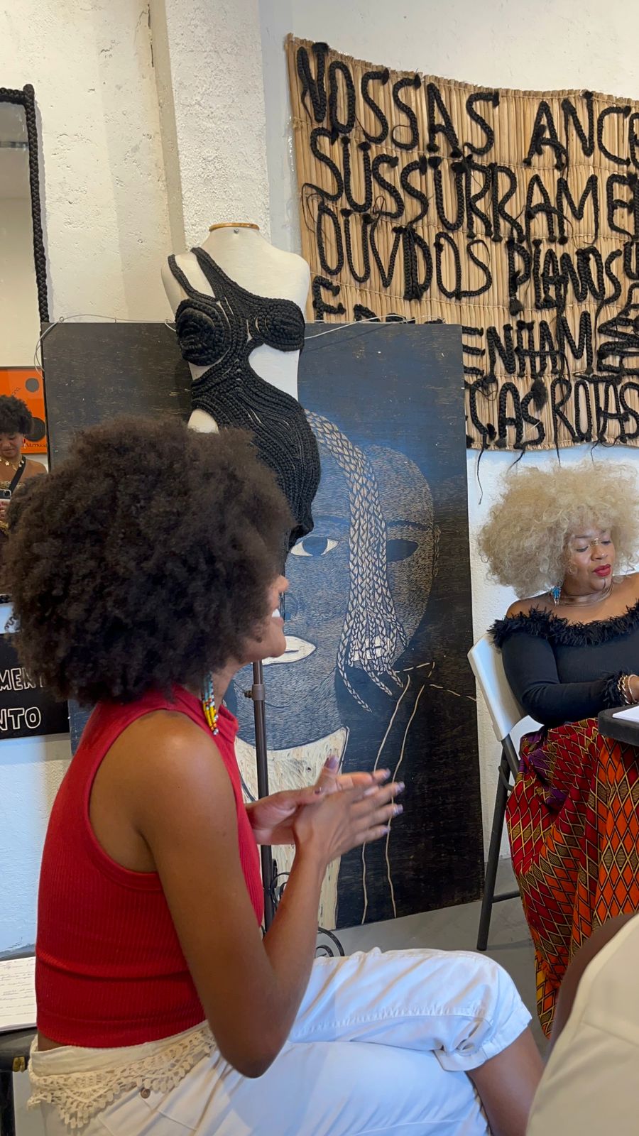 Desde o primeiro encontro, estamos trabalhando de forma transversal a construção do imaginário capilar, entendendo imaginário como o conjunto de imagens, memórias, narrativas e referências que moldam a forma como nos vemos, cuidamos e apresentamos nossos cabelos no mundo. Cada aula articula escuta, partilha, reflexão e prática, acessando memórias pessoais e coletivas e reconhecendo o legado das trançadeiras como tecnologia viva de cuidado, resistência e continuidade cultural.