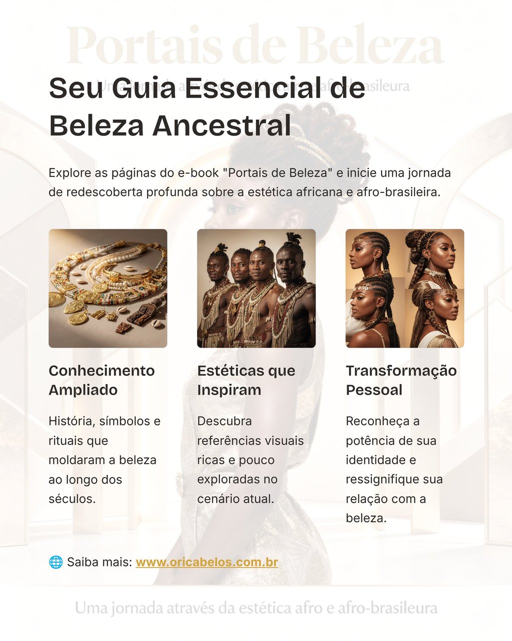 Portais de Beleza nasce de uma trajetória construída ao longo de anos mais de 20 anos de prática, pesquisa e reflexão sobre estética, cabelo e identidade. Nesse sentido preparei um material informativo de apoio iniciático onde proponho um olhar sensível e crítico sobre como o cabelo pode ser compreendido como linguagem, memória cultural e tecnologia ancestral.